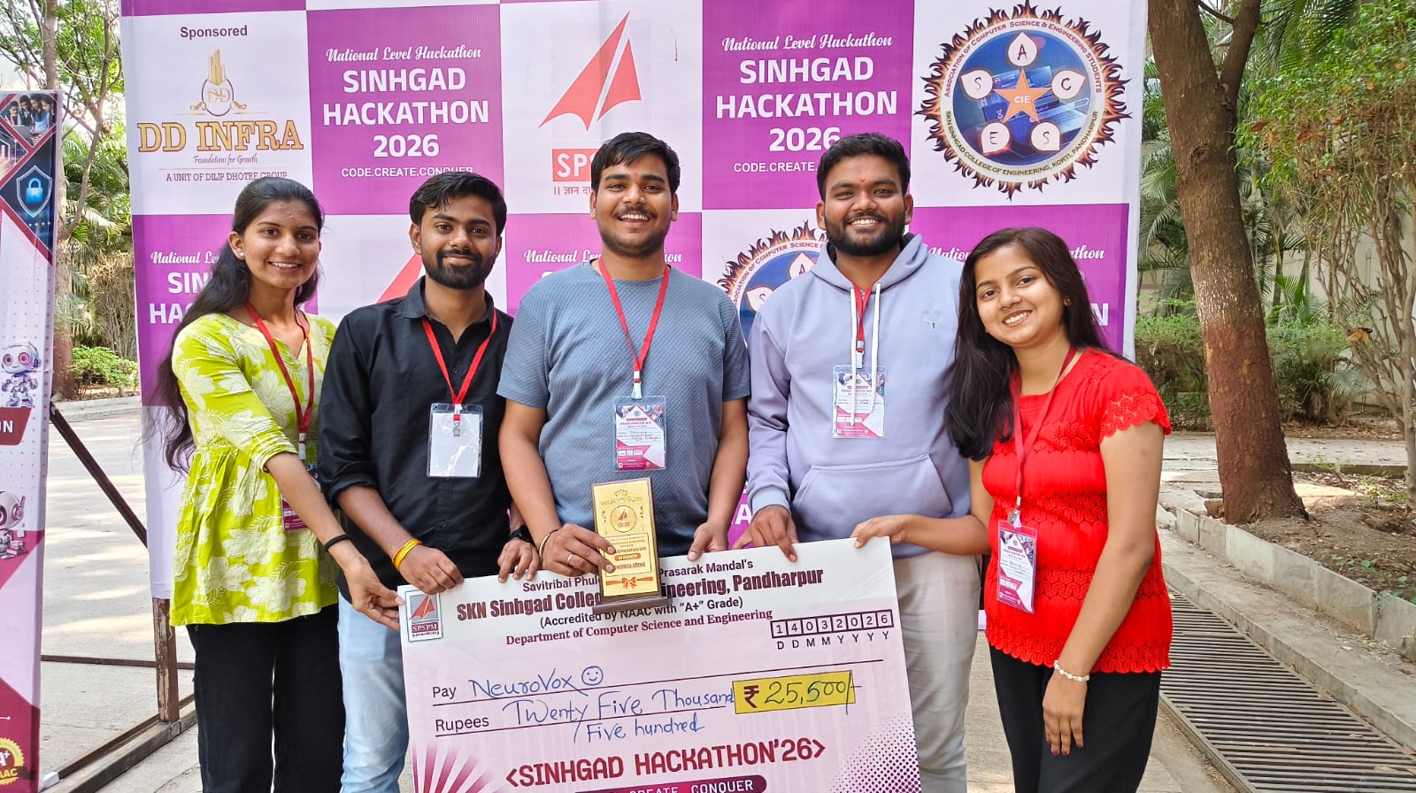Team Neurovox from the Department of Computer Science and Engineering has secured the 1st Prize (₹25,500) at the Sinhgad Hackathon 2026 , a 24-hour innovation and coding challeng....held on 13th–14th March at SKN Sinhgad College of Engineering, Pandharpur