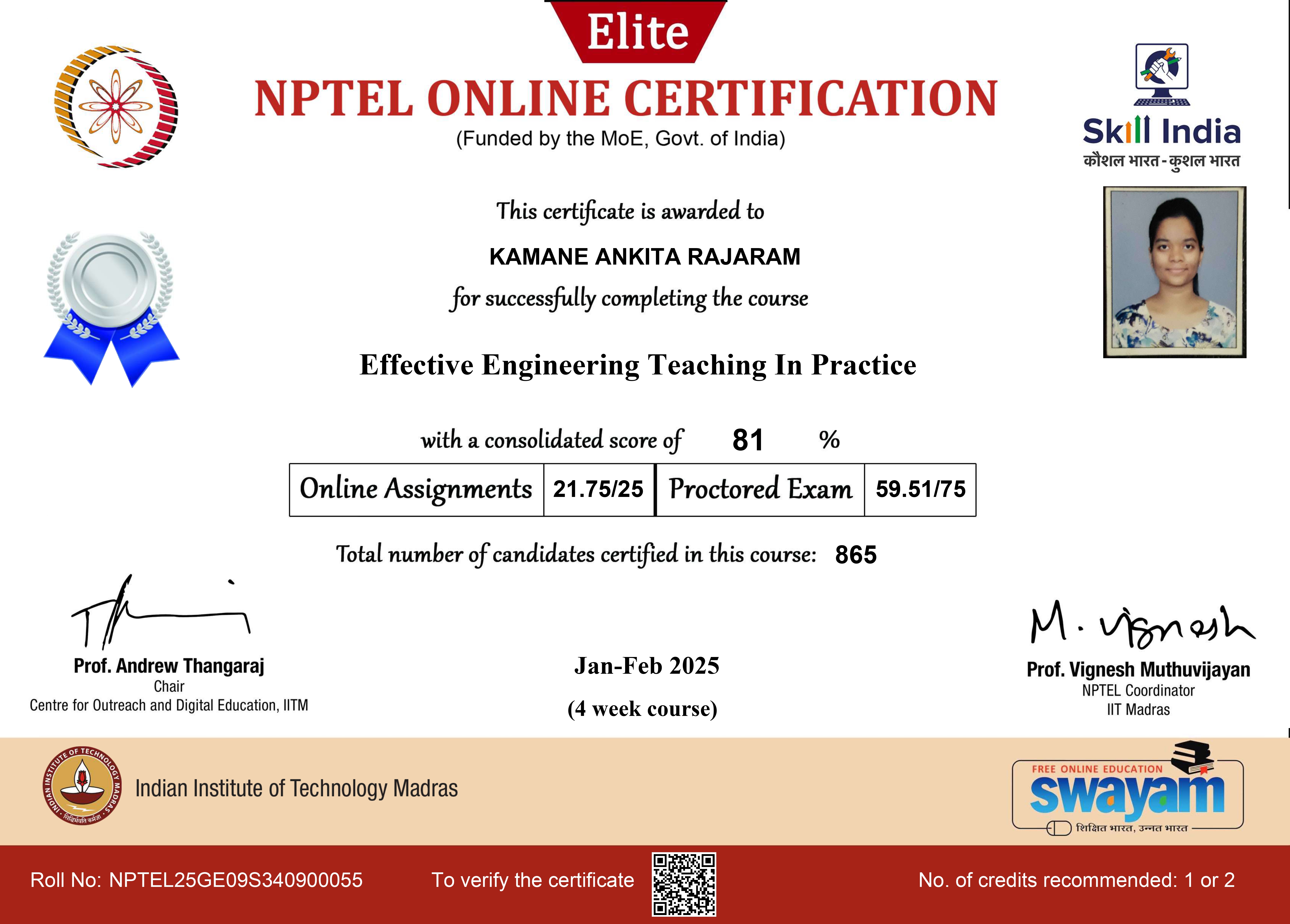 4 week Jan-feb 2025 Miss Ankita Rajaram Kamani for Successful completed NPTEL -Effective Engineering Teaching In P